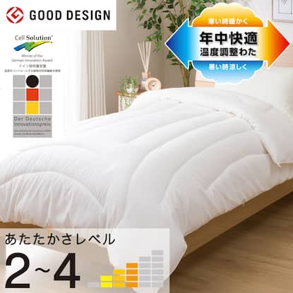 | 特徴 | 夏の不快な蒸れを軽減 接触冷感で涼しい | 季節の変わり目に最適 ホコリが発生しにくく清潔 | 素材や仕立てにこだわった ラグジュアリーな逸品 | 冬の定番モデル 毛布不要で一枚だけで暖かい | 特に寒がりの方へ 羽毛入りで最も暖かい |