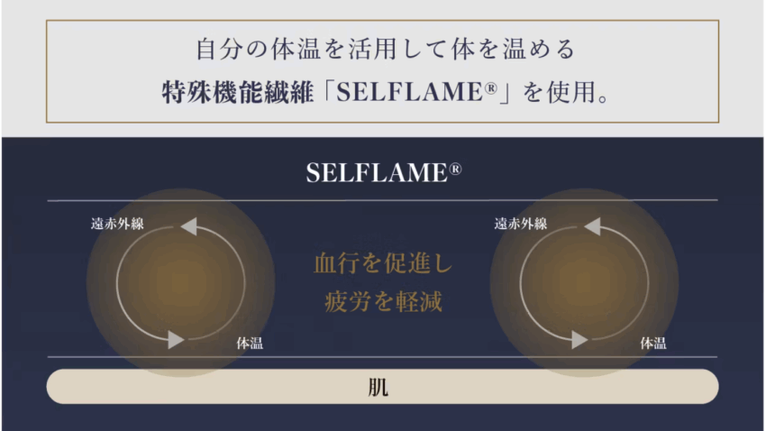 機能・効果快適性重視:通気性・吸湿性が高く蒸れにくい​。体を締め付けず寝姿勢を邪魔しないので安眠しやすい。ただし着用による積極的な疲労軽減効果は無し(医療機器ではない)体から発せられる遠赤外線を輻射させる特殊繊維「SELFLAME®︎」を使用。血行が促進されることで疲労回復が期待できます。一般医療機器届出済み。